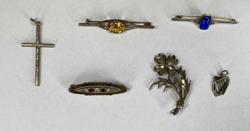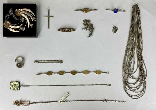 SILVER/WHITE METAL JEWELLERY including multi-strand necklace, topaz dress ring, leaf bracelet, Art Deco floral brooch, stone set brooch, crucifix, earrings etc.Provenance: private collection Conwy