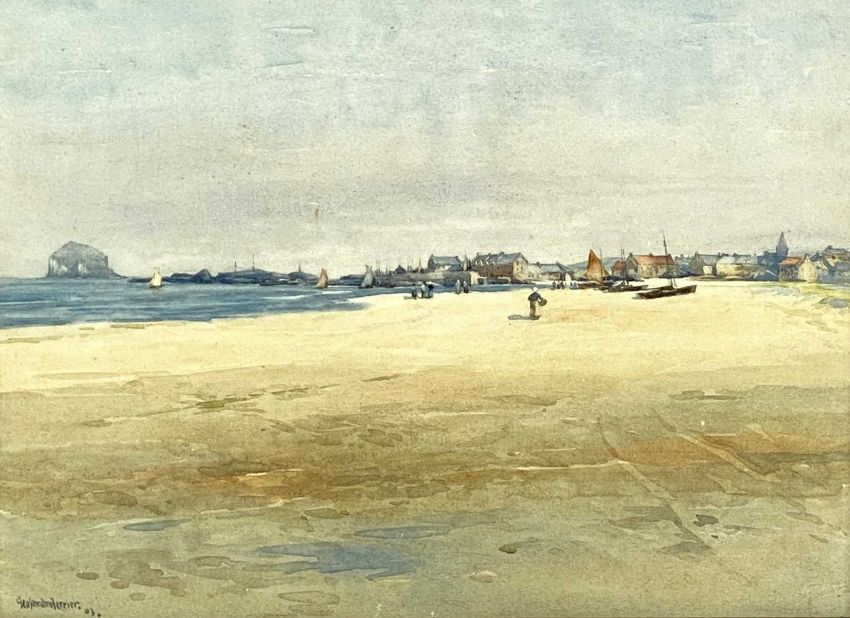 ‡ GEORGE STRATTON FERRIER RI, RSW, RE (Scottish 1852 - 1912) watercolour - coastal view with figures, buildings and boats showing Bass Rock on extreme left, titled verso 'North Berwick', signed and dated '03 lower left, 29 x 39cmsProvenance: private collection Conwy