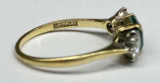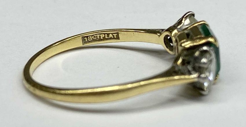 18CT GOLD & PLATINUM EMERALD & DIAMOND THREE STONE RING, size Q, 2.6gmsProvenance: deceased estate Conwy