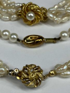 FRESHWATER PEARL TRIPLE STRAND NECKLACE with silver gilt clasp, 30cms (l), similar bracelet and simulated pearl single strand necklace, 46cms (l)Provenance: deceased estate Conwy
