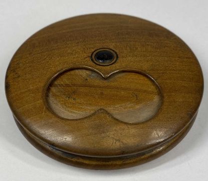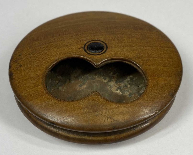 RARE VICTORIAN CIRCULAR FRUIT WOOD MISER'S SNUFF BOX having revolving cover, 9cms (diam.)Provenance: private collection Denbighshire