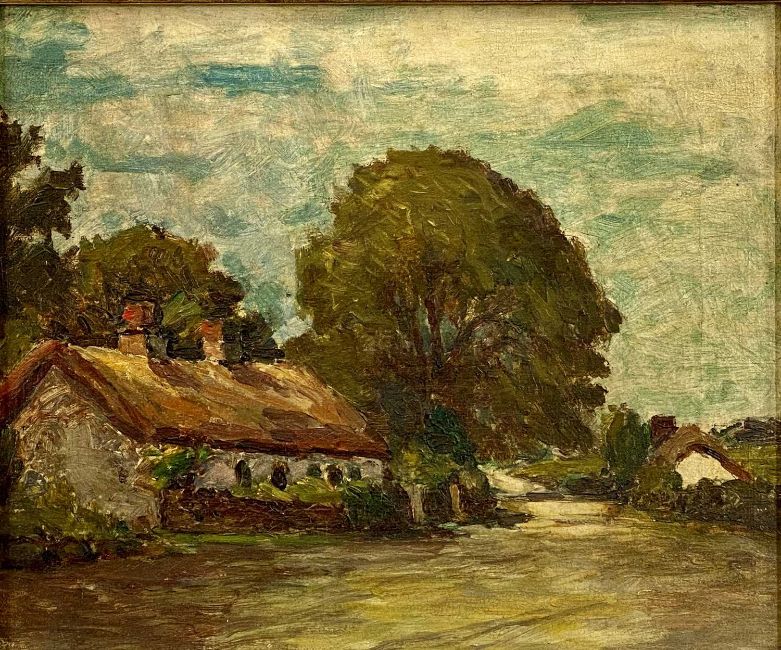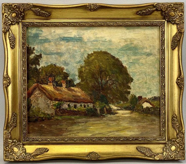 EARLY 20TH CENTURY BRITISH SCHOOL oil on canvas - thatched cottage and tree by country lade, unsigned, 24 x 29.5cms, CONTINENTAL oil on board - windmill and figures by lake in winter, indistinctly signed lower left, 19 x 24cms and 20TH CENTURY ENGLISH SCHOOL oil on canvas - still life jug of flowers, unsigned, 39.5 x 29cmsProvenance: deceased estate Ynys Môn