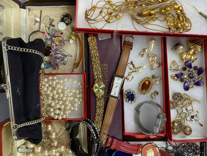 LARGE ASSORTMENT OF COSTUME JEWELLERY including boxed Ciro necklaces, various brooches, dress watches and other itemsProvenance: deceased estate Conwy