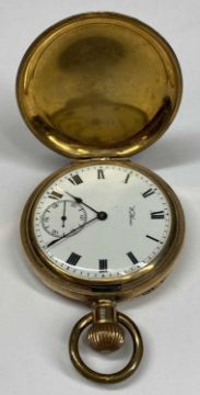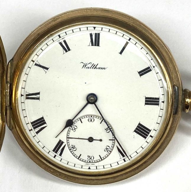 WALTHAM GOLD PLATED FULL HUNTER POCKET WATCH, keyless, signed white enamel dial with Roman numerals and subsidiary seconds dial, 50mms (diam.)Provenance: private collection Conwy