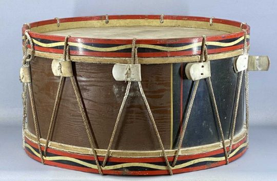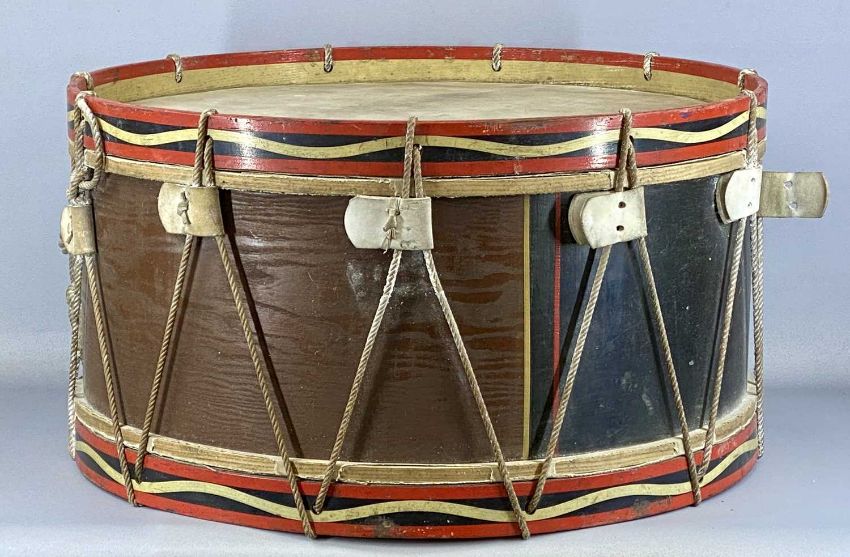 THREE VINTAGE DRUMS, painted wood frames with string tighteners, the largest 72cms (diam.), with two strikers and leather strapsProvenance: private collection Gwynedd, formerly Felinheli Marching Band