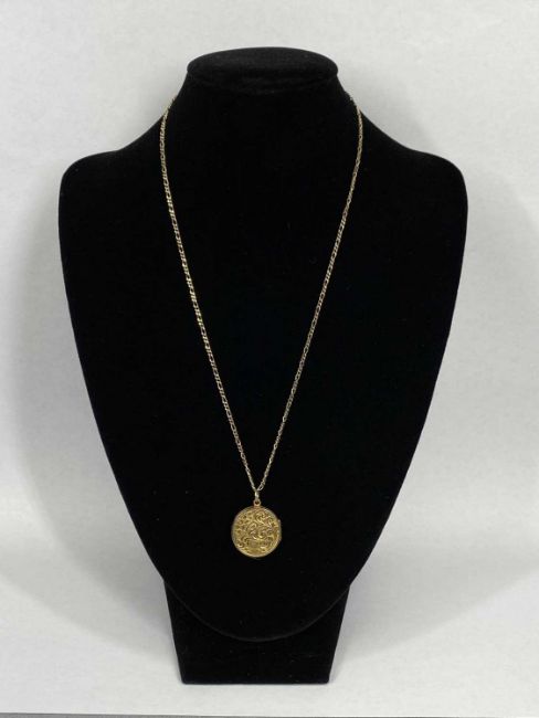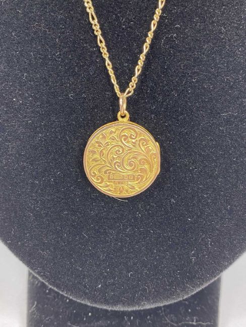 9CT GOLD CIRCULAR LOCKET, scroll engraved to front and back, 20mms (diam.), on 9ct gold fine link chain, 44cms (l), 4gmsProvenance: private collection Denbighshire