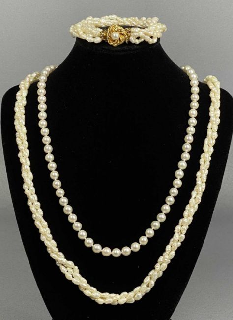 CULTURED PEARL TRIPLE STRAND NECKLACE with silver gilt clasp, 30cms (l), similar bracelet and simulated pearl single strand necklace, 46cms (l)Provenance: deceased estate Conwy