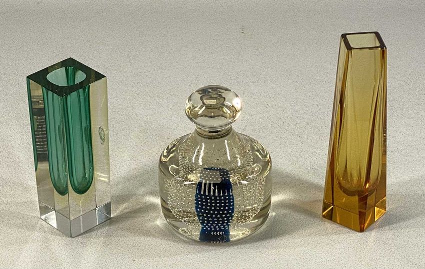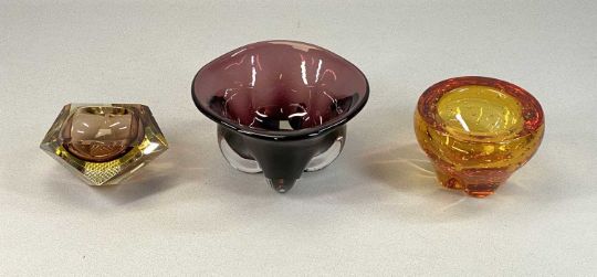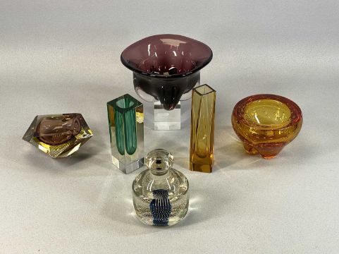 MURANO/ART GLASS COLLECTION including purple and clear glass bowl, 9.5cms (h), square green and clear glass posy vase, 13cms (h), shaped amber posy holder, 15.5cms (h), amber bubble glass ash tray, 12cms (diam.), paperweight, 12cms (h) etcProvenance: private collection Ynys Môn