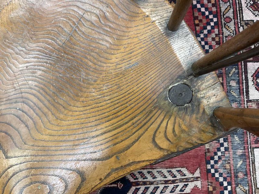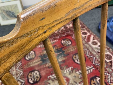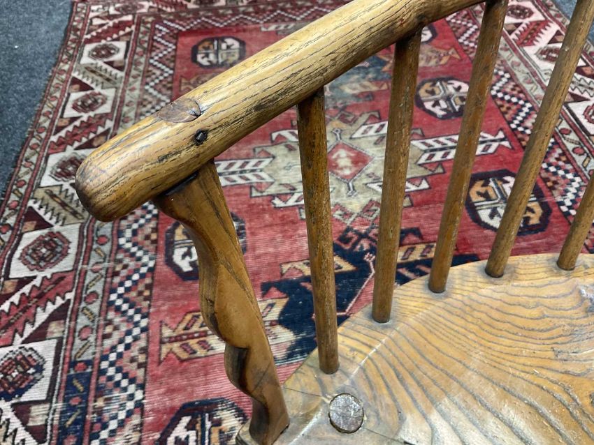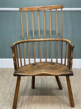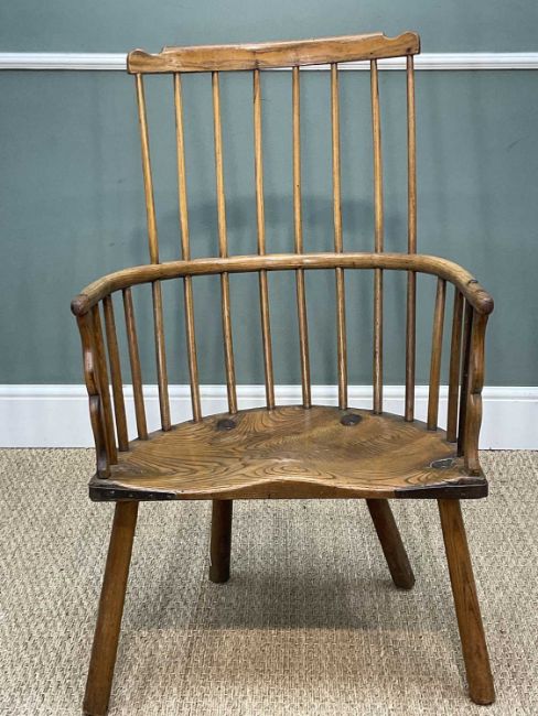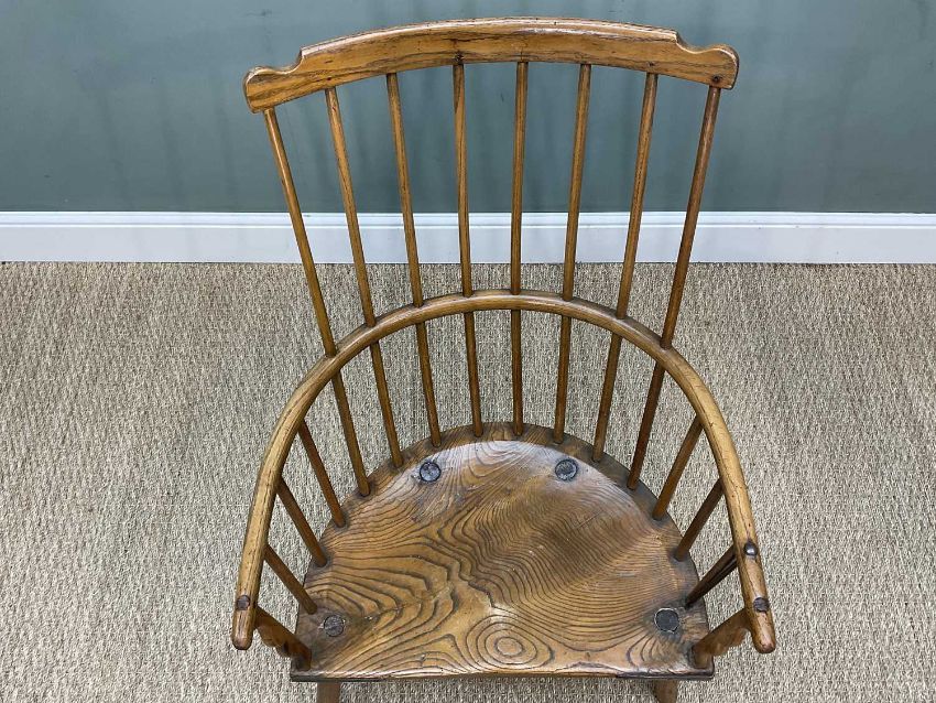 HANDSOME 19TH C. ASH STICK CHAIR, probably English, demilune and undercut saddle seat with hobnail secured iron brackets, sticks united by shaped cresting rail, one piece steamed arm rest, twin bow-carved front arm supports with later metal bar brace, splayed legs, seat height 39cms, 102 (h) x 60cms (w)Provenance: acquired in Kent mid-1990s; private collection Monmouthshire.Comments: modern glue visible underneath at leg joints