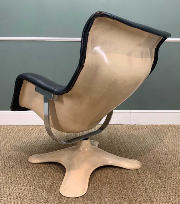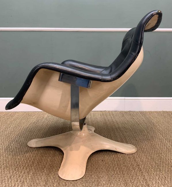 YRJÖ KUKKAPURO FOR ARTEK: KARUSELLI LOUNGE CHAIR, white reinforced fibreglass shell, inner shell upholstered in black leather, large chromed swivel steel bracket, reinforced fibreglass base, 90 (h) x 79cms (w)Provenance: private collection GwyneddComments: appears structurally sound, chips to fibreglass base, leather dry/cracked and the foam beneath feels degraded, the chair will swivel but not tilt, chromed bracket pitted/surface rust, inspection advised