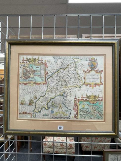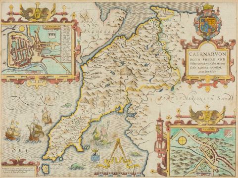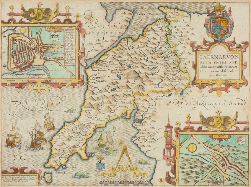 SPEED (JOHN) Caernarvon-Shyre, double page engraved map with later hand colour by Thomas Bassett & Richard Chiswell, c.1676, 37 x 49.5cmComments: framed and double glazed, some minor foxing and discolouration