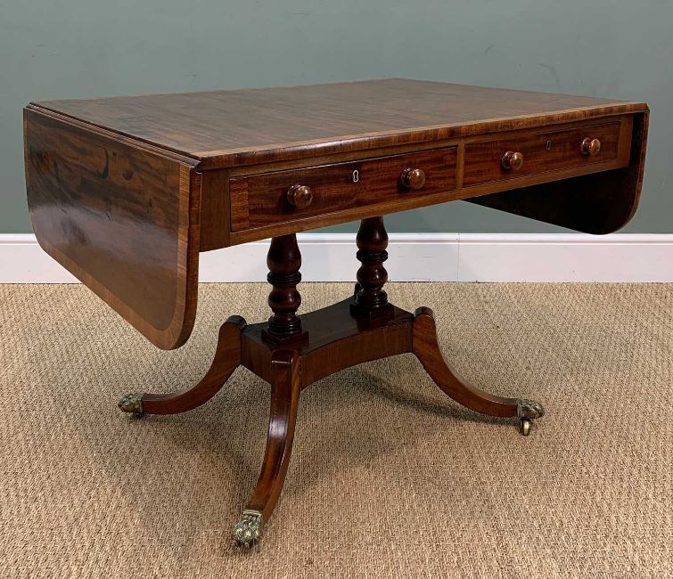 LATE REGENCY MAHOGANY CROSSBANDED SOFA TABLE, two full-length frieze drawers with dummy opposites, twin baluster stems on concave platform, splayed, box-strung legs, brass lions paw capping with brass castors, 71 (h) x 100 (w) (150 extended) x 76cms (d)Provenance: private collection CardiffComments: top stained, old scratches/bumps etc, veneer repairs