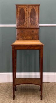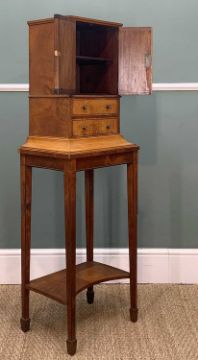 GEORGE III SATINWOOD COLLECTOR'S CABINET ON STAND, of small proportions, with oval panelled doors above two long drawers, on stand with tapering sqaure legs joined by concave fronted platform stretcher, spade feet, 124 (h), 42 (w) 29cms (d)Provenance: private collection CardiffComments: minor veneer losses, front leg trim/moulding detached but present