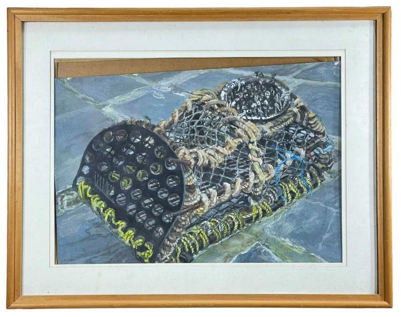 ‡ PHILIP MUIRDEN (1932-2023) oil on paper - a lobster pot, signed verso, 52 x 73cmsAuctioneers Note: Philip Muirden was born in Pembrokeshire and educated at Haverfordwest Grammar School. He went on to study at Cardiff College of Art before completing a Master’s Degree at The Royal Academy of Art. Philip became a lecturer at Mansfield College of Art from 1965 to 1972 and a Senior Lecturer at Newport College of Art from 1972 to 1991. A draughtsman of the very highest order, Philip’s drawings of marine subjects are both breath-taking and brilliant in their observation and what he described as ‘retinal experience’. There is a strong surreal element to his paintings, showing very imaginative and poetic handling with what he termed ‘considerations of surreal and social themes’. During his life as an artist Philip Muirden always avoided the production of works with a unified, pre-conceived brand image. His output contains celebrations of his ‘retinal images’, such as the wonderful fishing boat subject matter he painted. His intellectually inspired work and reflections on the human condition were frequently presented.Provenance: decreased estate, PembrokeshireComments: painting has slipped, framed, glazed