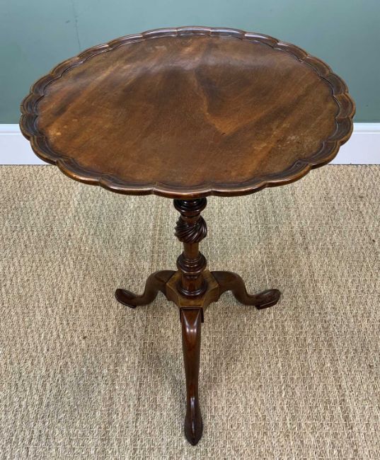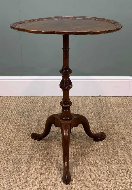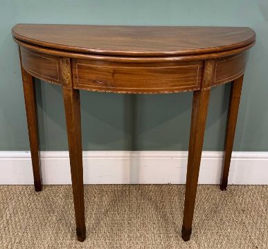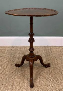 ASSORTED ANTIQUE TABLES including, Georgian banded mahogany demi-lune tea table, 75 (h) x 92 (w) x 46cms (d), mahogany pie-crust table, 72 (h) x 53cms (dia.), square two-tier Edwardian occasional table with fretwork frieze, 72 (h) x 53cms (sq.), Regency style mahogany serpentine rectangular table, 73 (h) x 92 (w) x 50cms (d) (4)Provenance: private collection CardiffComments: demi-lune with repairs, pie-crust top warped, general wear, scratches, fade etc, inspection advised