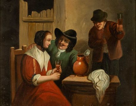 FOLLOWER OF TENIERS oils on board - two tavern scenes, depicting topers with lady in red, and gamblers with man in feathered cap, 16 x 19cms (2)Provenance: private collection CardiffComments framed ready to hang.