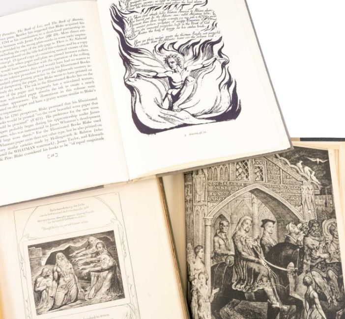 WILLIAM BLAKE RELATED: Essick (Robert N.) William Blake's Relief Inventions, William & Victoria Dailey The Press of the Pegacycle Lady, 1978, introduction by W B Yeats, 7 colour illustrations, no. 200/365 copies on Rives, printed by Patrick Reagh, folio; ..BINYON, (LAURENCE) [ed.] William Blake. Illustrations of The Book of Job with a General Introduction, Methuen, 1906, folio, vol. 1 only,. gilt tooled green cloth boards (2)Provenance: private collection Vale of GlamorganComment: former blue paper boards marginally faded top and bottom, back cover marked, latter generally lightly rubbed and foxed throughout.