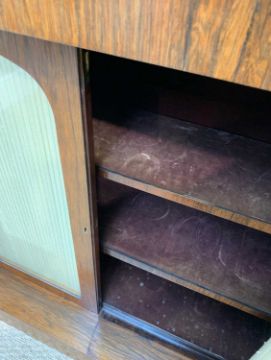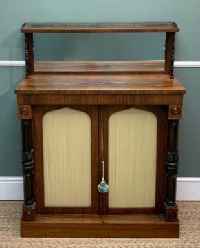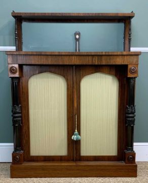 WILLIAM IV ROSEWOOD CHIFFONIER, single shelf, three-quarter brass gallery, metal supports, mirror back, cupboard below with two glazed doors flanked by metal columns with acanthus leaf decoration, two shelves within, felt-lined with rosewood edging, 125 (h) x 95 (w) x 40cms (d)Provenance: private collection CardiffComments: very minor fading