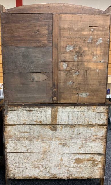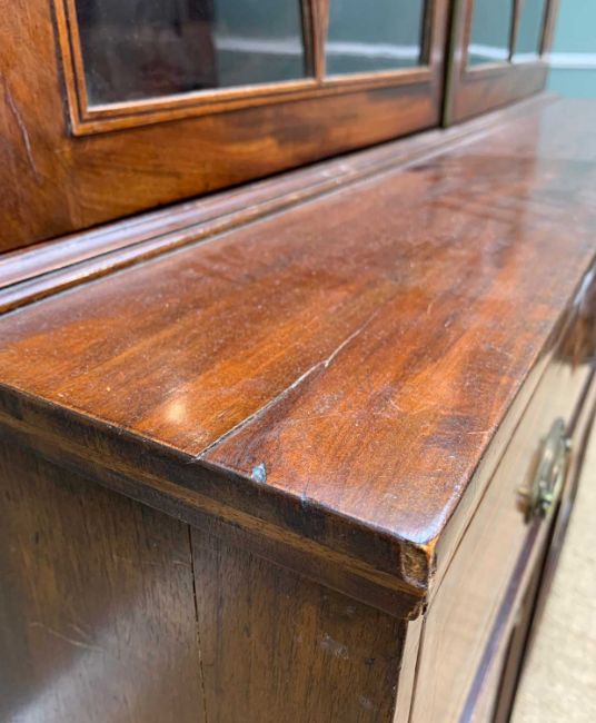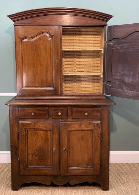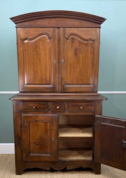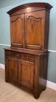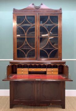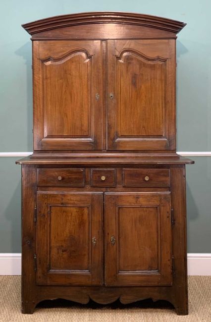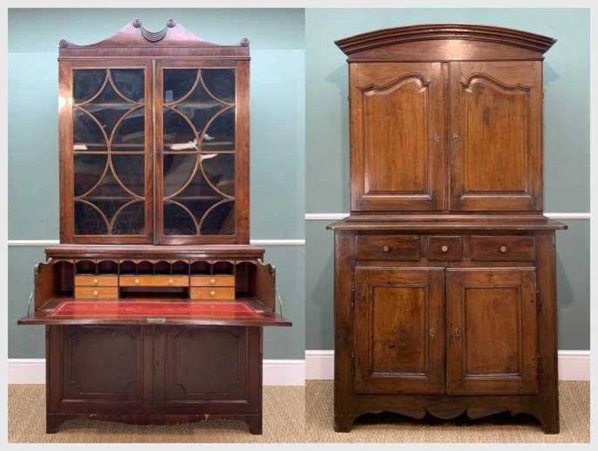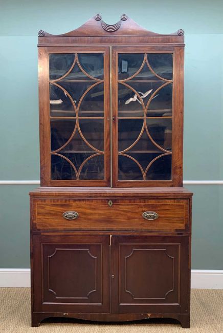 EARLY 19TH C. MAHOGANY SECRETAIRE BOOKCASE, astragal glazed double doors, adjustable shelves, fitted secretaire drawer over double cupboard base (a marriage), 227 (h) x 114 (w) x 51cms (d), minor moulding loss to cornice, warped fall, cupboard doors replaced and with moulding losses, veneer losses, inspection advised, together with, 19TH C. PROVINCIAL ITALIAN WALNUT CABINET, domed cornice above fielded panel doors on a cupboard base fitted three frieze drawers, 117 (w) x 48 (d) x 203cms (h), old worm (filled) to front upper panels, old worm damage to rear panels, general bumps and wear, inspection advised (2)Provenance: private collection LondonComments: in description