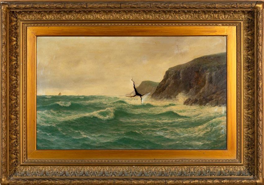DAVID JAMES (1860-1904) oils on canvas - coastal landscape, depicting waves crashing with fishing boats and steamer on horizon, inscribed verso 'At Sea Crashing. Coast of Cornwall', signed and dated '86, 44 x 75cmsProvenance: private collection CardiffComments: nicotine stained, retaining Frost & Reed labels verso, with large tear central