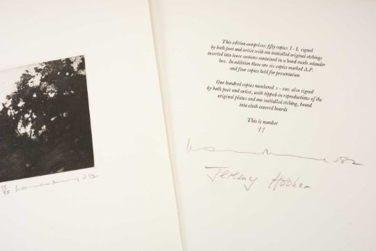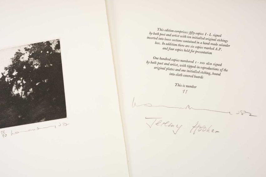 HOOKER (JEREMY) & ACKROYD (NORMAN) Itchen Water, poems 1982, Winchester School of Art Press, 4to., limited edition (11/100), signed by the poet and the artist, comprising ten tipped in original etchings all signed and titled in pencil, and a loose additional etching similar, , Provenance: private collection Vale of Glamorgan.Comments: excellent condition.