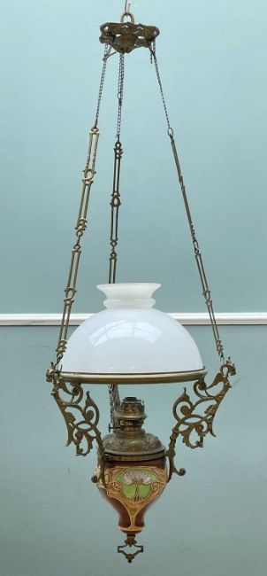 ART NOUVEAU POTTERY HANGING OIL LAMP, French or Belgian, with opaque glass shade gilt metal suspension with counterweightProvenance: private collection LondonComments: usual wear