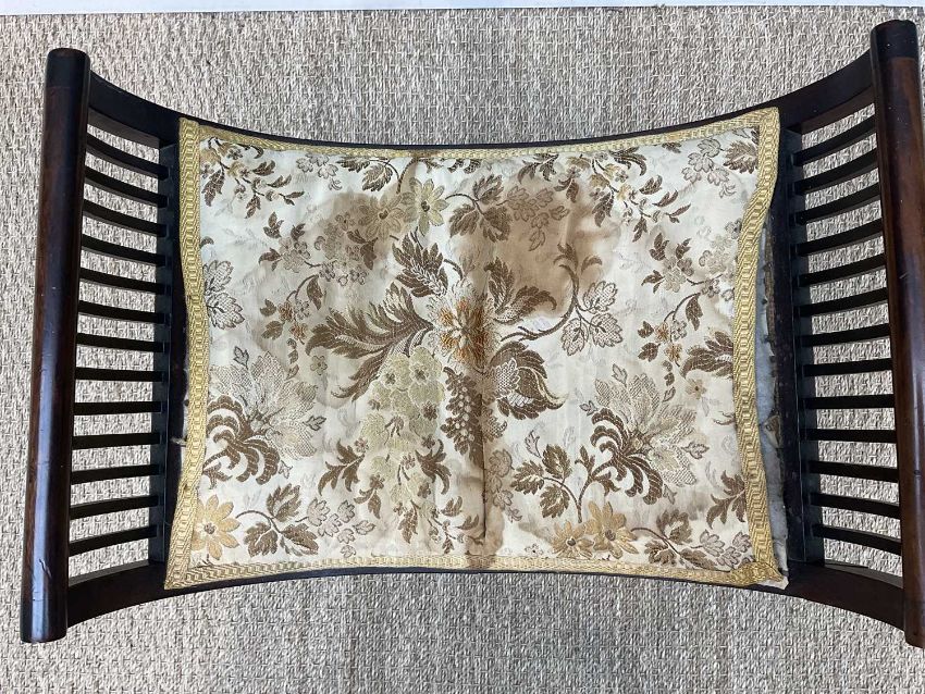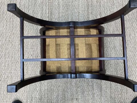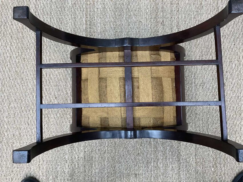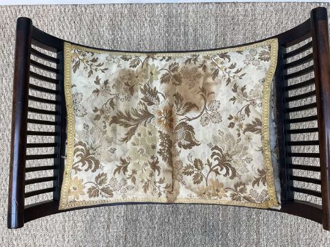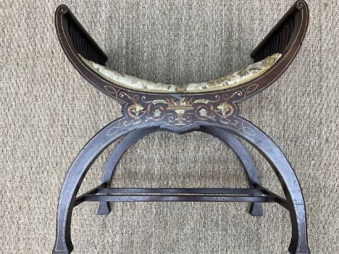EDWARDIAN RENAISSANCE REVIVAL MARQUETRY STOOL, of bowed X-form, inlaid friezes to both sides, legs joined by bar stretchers, 57cms (w)Provenance: private collection CardiffComments: minor losses to marquetry, seat cover stained