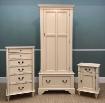 CONTEMPORARY LAURA ASHLEY 'CLIFTON' IVORY BEDROOM FURNITURE comprising, six drawer chest, 109 (h) x 59 (w) x 37cms (d), single door/single drawer wardrobe, 202 (h) x 83 (w) x 59cms (d), four drawer demi-lune chest, 78 (h) x 85 (w) x 40cms (d), five drawer dressing table and stool, 78 (h) x 125 (w) x 43cms (d), one drawer/one cupboard beside table, 71 (h) x 45 (w) x 36cms (d) (5)Provenance: private consignment West WalesCondition: stains, rub marks, general wear, some residual glue marks, minor chips, no key, stool fabric stained, inspection advised