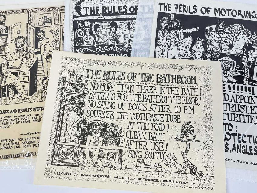 ‡ KAREL LEK folder of prints - interesting collection of the artist's 'Leksheet' commercial prints for the home with topics of morality in the manner of William Hogarth, twelve various images with multiples, various sizes with average size 37 x 27cmsProvenance: private collection GwyneddAuctioneer's Note: the Leksheets were sold in the artist's gallery shopComments: unmounted and unframed