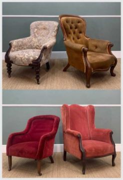 FOUR ANTIQUE ARMCHAIRS including, Victorian walnut chair with buttoned mustard cloth upholstery, mahogany chair with floral cloth upholstery, scrolled arms, bobbin turned legs, and two red velvet armchairs (4)Provenance: private consignment West WalesComments: mustard cloth faded, frame loose, paler velvet chair with stains to seat and back, other with loose cord trim, general used condition, viewing advised