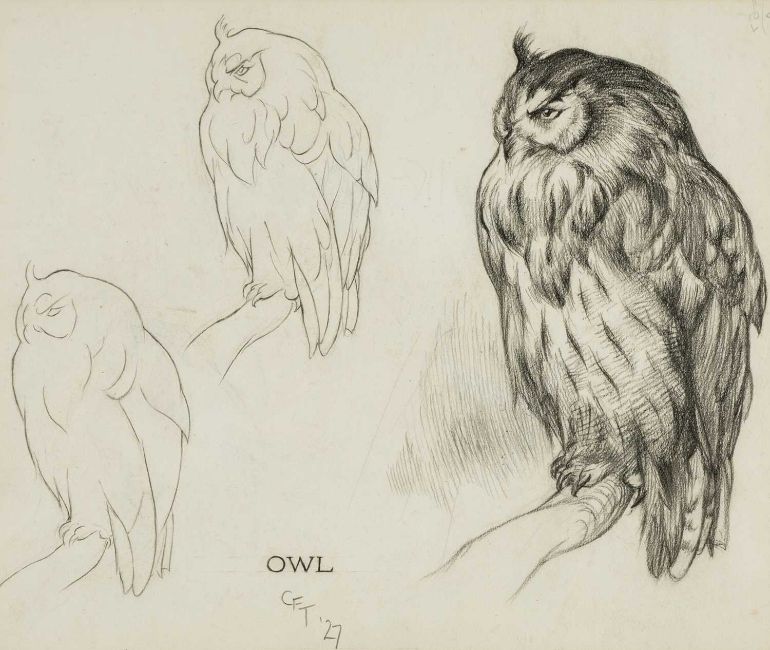‡ CHARLES FREDERICK TUNNICLIFFE OBE RA (English, worked Wales 1901-1979) pencil - studies of an ostrich, signed with initials, dated '27, 24 x 28cms, an owl, signed and dated '27, 24 x 28cms and pelican, signed with initials, dated '27, 24 x 28cms (3)Provenance: private collection GwyneddComments: all framed and glazed