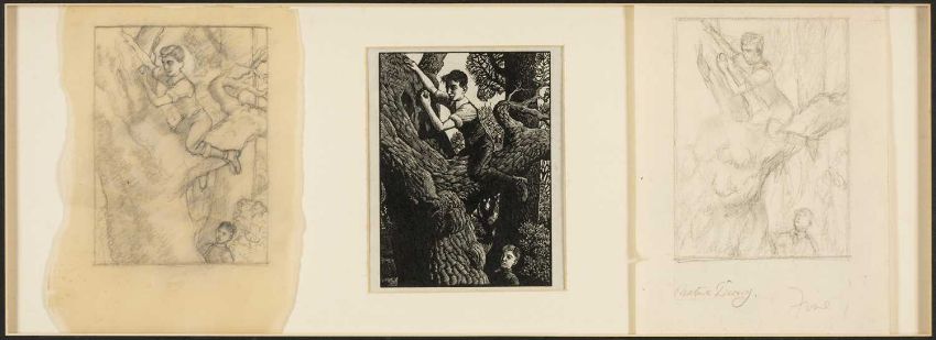 ‡ CHARLES FREDERICK TUNNICLIFFE OBE RA (English, worked Wales 1901-1979) etching - two young boys climbing a tree, with two flanking associated working drawings, 14 x 12cms together with a portrait of author Ifan Gruffydd, pencil on paper, with note verso, 'This is to certify that my good friend C F Tunnicliffe RA drew this portrait at my request and that I could oblige my friend Evan author of Y Gwr o Baradwys with a picture of the character about whom he was writing an article, T G Walker, 18th Feb 1983', 19 x 18cms (2)Provenance: private collection GwyneddComments: foxing present on the portrait, both presentations framed and glazed