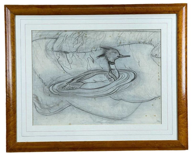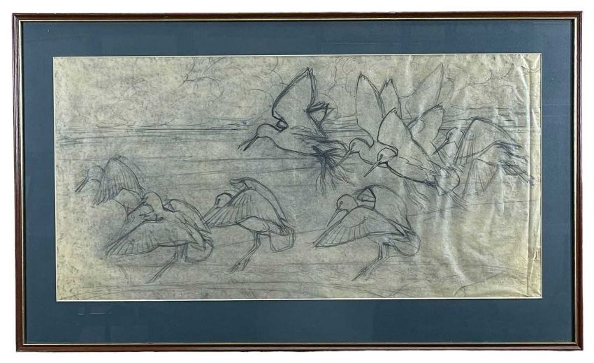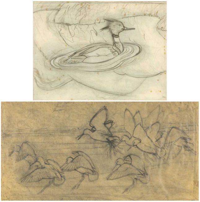 ‡ CHARLES FREDERICK TUNNICLIFFE RA OBE RA (English, worked Wales 1901-1979) two pencil on paper preliminaries - comprising (1) birds landing, 36 x 72cms; (2) red-breasted merganser on water, 40 x 56cms (2)Provenance: private collection GwyneddComments: paper creased on the right side, tear in top corner, hole in paper bottom right, the red-breasted merganser has foxing. Both framed and glazed
