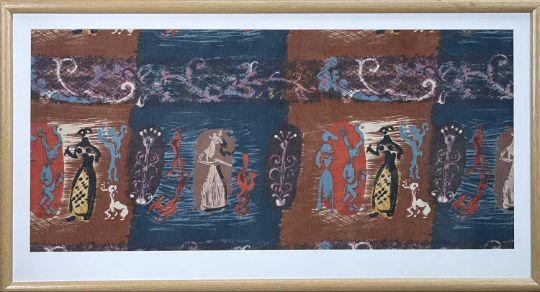 ‡ JOHN PIPER (British 1903-1992) screenprint on fabric for David Whitehead- entitled 'Figures from a Cretan Seal', 43 x 95cmsProvenance: private collection CheshireComments: framed and glazed