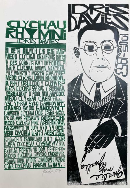 ‡ PAUL PETER PIECH (American, lived / worked Wales 1920-1996) woodcut print - Welsh language poem by Idris Davies entitled, 'Clychau Rhymni', (Rhymny Bells), signed and dated 1991, 64 x 45cmsProvenance: private collection NetherlandsComments: unframed