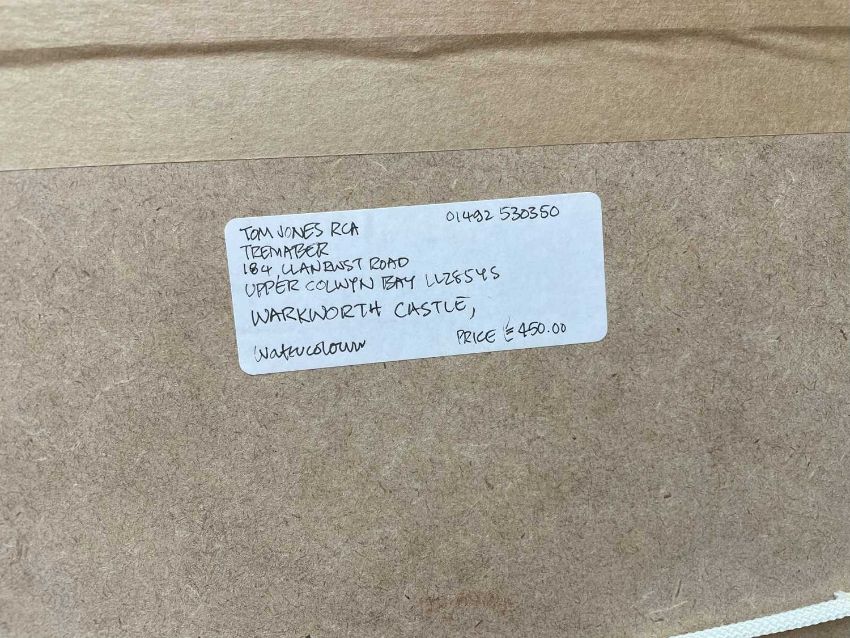 ‡ TOM JONES (Welsh 20th Century) watercolour - entitled verso 'Warkworth Castle', signed with monogram, 32.5 x 52cmsProvenance: private collection ConwyComments: framed and glazed
