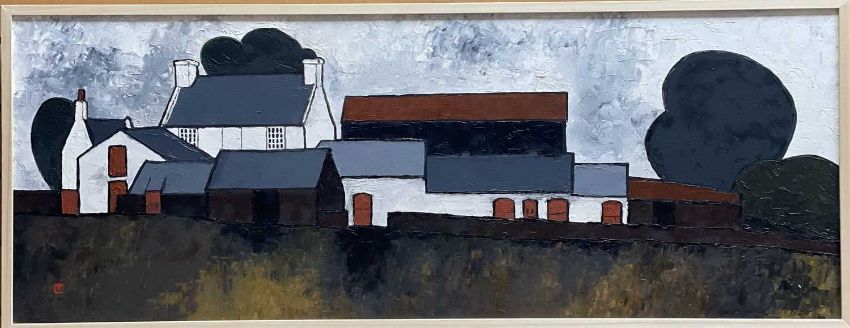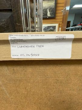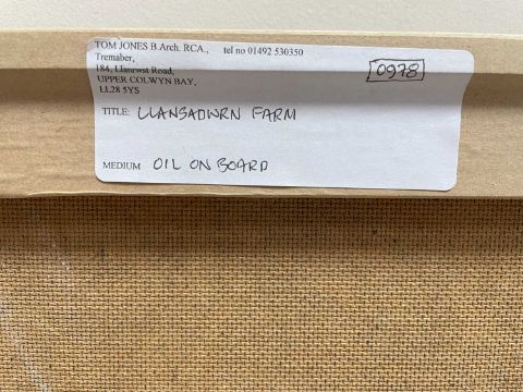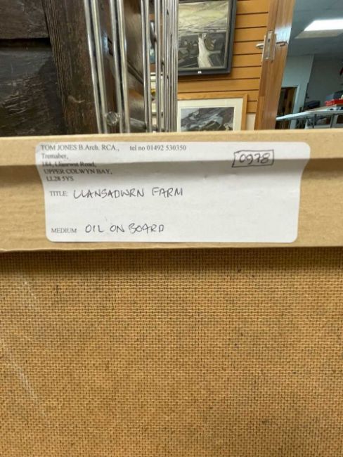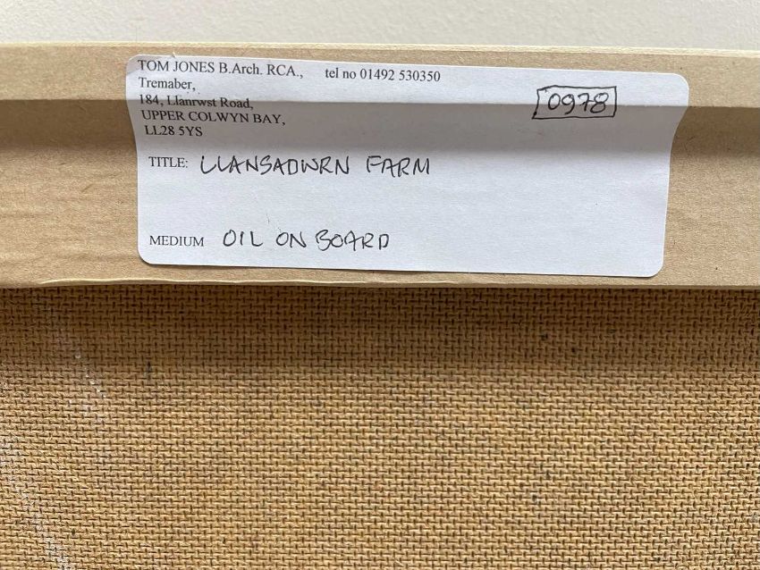 ‡ TOM JONES (Welsh 20th Century) oil on board - entitled verso 'Llansadwrn Farm', signed with monogram, 44.5 x 119cmsProvenance: private collection ConwyComments: framed