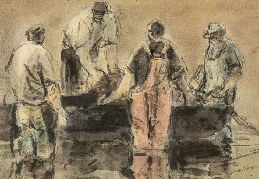 ‡ WILLIAM SELWYN (Welsh b.1933) mixed media - entitled verso 'Fishermen on the Menai Straits', signed, 23 x 34cmsProvenance: private collection CeredigionComments: framed and glazed