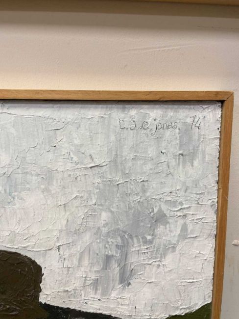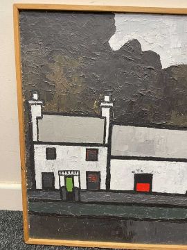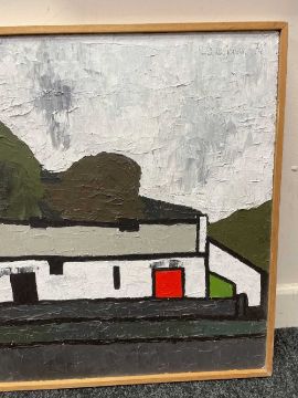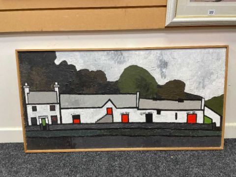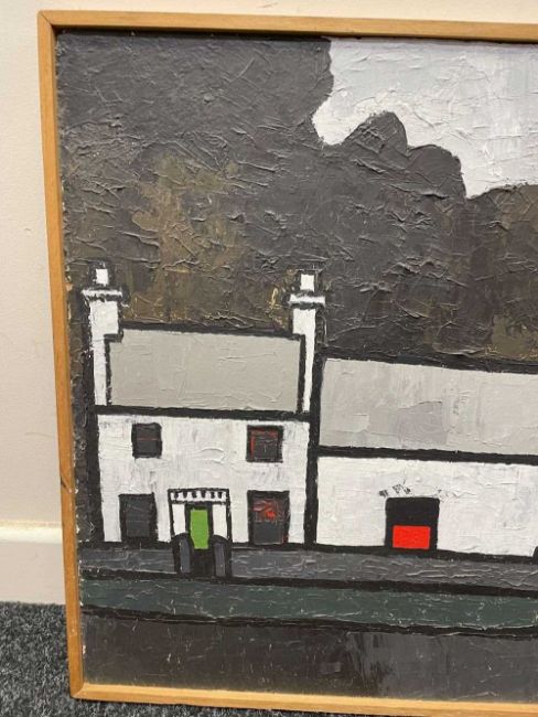 ‡ TOM JONES (Welsh 20th Century) oil on panel - village scene with buildings, signed and dated '74, 53.5 x 106cmsProvenance: private collectionComments: framed