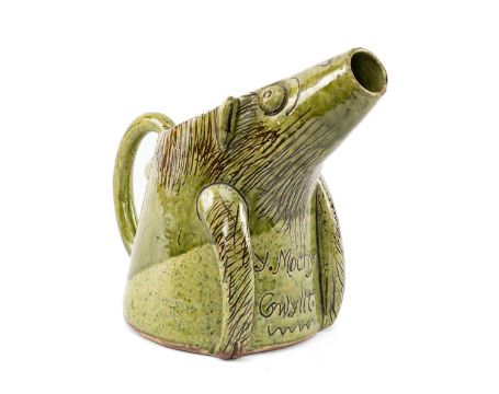 RARE EWENNY 'Y MOCHYN GWYLLT' ZOOMORPHIC JUG, speckled and plain two-tone green glazed terracotta, with sgraffito details and legend, base incised 'Ewenny Pottery 1910' in the distinctive script of E. Jenkins, 19.2cms (h)Provenance: consigned from West WalesAuctioneer's Notes: this shape of jug made by Ewenny potters is from a design by Horace Elliot, registered in 1890. See J M Lewis, The Ewenny Potteries (1982), pp 28-31 and p.96. The Welsh legend translates as 'The Wild Pig'.Comments: excellent all over.