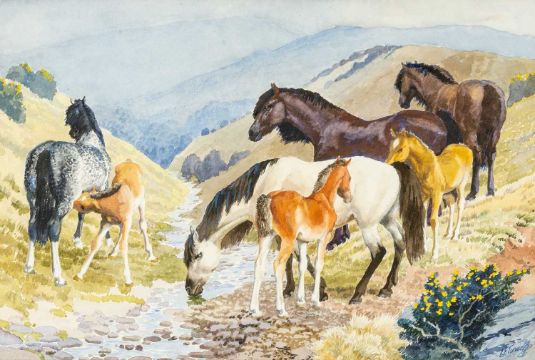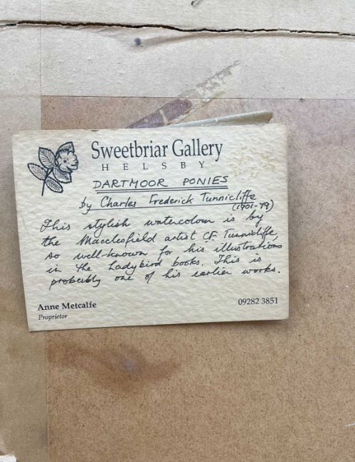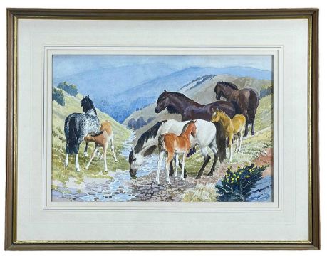 ‡ CHARLES FREDERICK TUNNICLIFFE RA OBE (English, worked Wales 1901-1979) watercolour - entitled verso 'Dartmoor Ponies' on Sweetbriar Gallery label, signed, 39 x 59cmsProvenance: private collection LondonComments: framed and glazedFree Delivery: bidders with invoices over £4000 in this Welsh Sale can benefit from free insured delivery to their home (England and Wales only). To enquire about this service, please email brj@rjauctions.co.uk