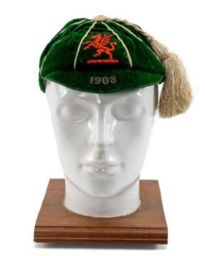 THE FOOTBALL CLUB HOUSE: 1903 FOOTBALL ASSOCIATION OF WALES CAP, awarded to R. Morris, green velvet with white silk button, segment borders and tasselAuctioneer's Note: believed to relate to Robert Morris, born Oswestry, 1875; died Chirk, 23 September 1926.Morris was a centre half with 6 caps: (Chirk) v England, Ireland 1900; v Ireland 1901; Scotland 1902; (Shrewsbury T) v England, Ireland 1903. Career: Chirk 1893-1902; Shrewsbury T 1902-07; Chirk 1907-09. 'Bob' Morris was said to be an excellent defender and good leader, somewhat surprisingly, never made it beyond the Birmingham and District League but was briefly on Manchester City’s books. A one-time Chirk captain, he was comfortable at left back or centre half and one writer called him “unapproachable”, adding “his defence of the ball was very uncommon”. Morris was strong in the air and was keen to go forward for corners and free kicks - an early exploiter of what is now known as the “set piece”. A careful player, he relied on his well-developed positional sense and was “entirely safe”. Morris, a brother to Jack and Charlie, captained Shrewsbury to a Shropshire Cup success in 1904 before returning to a Chirk club in decline. An official at Brynkinalt colliery, he was later chairman of the Chirk club. Honours: Shropshire Cup Winner 1903, 1904Provenance: by descent, private collection Ynys Mon, Robert & Richard Morris (vendor's mother's uncle), items in this auction believed to have belonged to Robert, but both played for Wales, Chirk FC,however Robert 'Bob' had a longer playing careerComments: good, lining faded, creases and rubbing, excellent overall