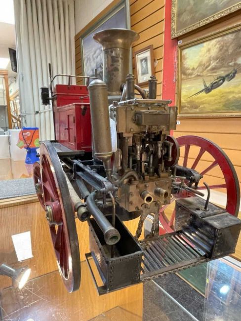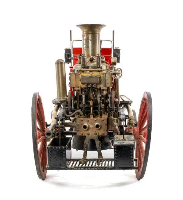 THE MODEL CLUB HOUSE: SCRATCH BUILT LIVE STEAM MODEL OF A SHAND MASON FIRE ENGINE, named to Colwyn Bay Fire Dept., with vertical brass boiler, steam fittings, twin-cylinder live steam engine, wooden spoked wheels and coal bunker, wooden body with suction and delivery hoses, and driver's seat with brass seat rail and footrest, electric alarm bell, pressure gauge, white water hose, twin operating ratchet lever brakes, oval plaque 'Shand Mason & Co, Engineers, London', 52 (w) x 27 (d) x 37cms (h).Provenance: private collection ConwyAuctioneer's Notes: Shand Mason & Co operated from premises in Blackfriars, London, and having initially manufactured manually operated pumps, secured various patents to improve the design and construction of steam fire engines. While the first steam-powered fire engine had been developed by John Braithwaite and John Ericsson in 1829, the first commercially successful fire-engine was a water-borne version developed by Shand Mason & Co, which went into service in 1855. From this point and particularly from the 1860s, the company worked with the chief of the Metropolitan Fire Brigade, Eyre Massey Shaw and with competitor Merryweather & Sons, to perfect designs for land-based use by the London brigade and other municipalities. Its first land-based engine used by the brigade was produced in 1860. Its engines were initially horse-drawn, but later installed on fireboats (Europe's first, the Fire Queen was built by Shand Mason for service in Bristol's docks in the 1880s) and mounted on motor vehicles. The business was eventually taken over by Merryweather & Sons in 1928.Comments: surface dust, battery compartment wiring loose, NB. NOT tested for pressure, sold as a decorative model, not a working engine.