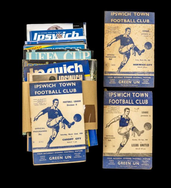 THE FOOTBALL CLUB HOUSE: IPSWICH TOWN PROGRAMMES OF SEASONS 1954-2008, programmes of note include Leeds United vs Ipswich Town dated September 25th 1954 and Ipswich Town vs Norwhich City dated March 30th 1956, approx. 50 programmesProvenance: the collection of the former BBC Wales football commentator Richard Shepherd, please see lot 175 for further detailsComments: good overall but viewing recommended