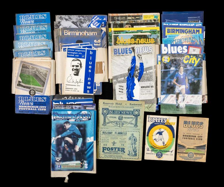 THE FOOTBALL CLUB HOUSE: BIRMINGHAM CITY PROGRAMMES OF SEASONS 1927 - 2005, programmes of note include Birmingham City vs. Cardiff City dated April 27th 1927 (tape to seams and slight staining), Birmingham City vs. Hull City dated November 15th 1952 and Birmingham City vs. Cardiff City dated April 7th 1956 (with associated newspaper cuttings), approx. 110 programmesProvenance: the collection of the former BBC Wales football commentator Richard Shepherd, please see lot 175 for further detailsComments: good overall but viewing recommended