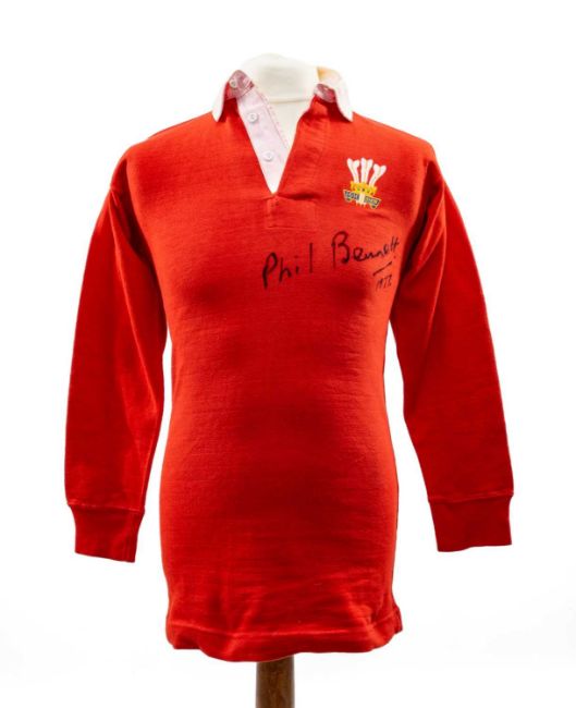 THE RUGBY UNION CLUB HOUSE: MATCH WORN & SIGNED WALES JERSEY FOR PHIL BENNETT OBE (1948-2022) 1977, bearing embroidered Prince of Wales Feather to chest with signature of 'Phil Bennett 1977' in pen below, hand-stitched felt no.10 in white to rear, yellow printed Umbro Sportswear emblem to bottom waist band, internal maker's mark 'Umbro International Sportswear', size XOSProvenance: private collection, with BonhamsComments: some fading to collar, sl. fading to red of shirt