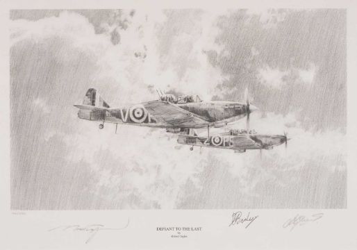 ‡ MILITARY / AVIATION CLUB HOUSE: ROBERT TAYLOR (British b.1946) limited edition (166/250) and (102/250) lithographs - 'Defiant To The Last' and 'Battle Over Dover', signed and numbered in pencil, first with additional signatures of Frederick Barker, D.F.M. and Herbert Green, M.B.E. in margin, (I) both around 22 x 37cms (2)Provenance: private collection CardiffComments: framed and glazed, ready to hang