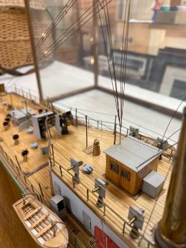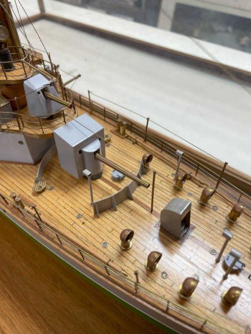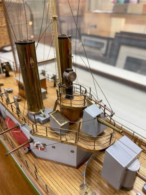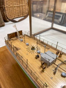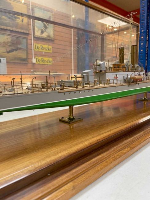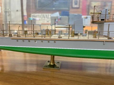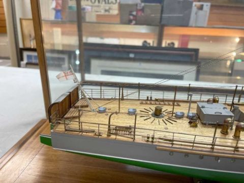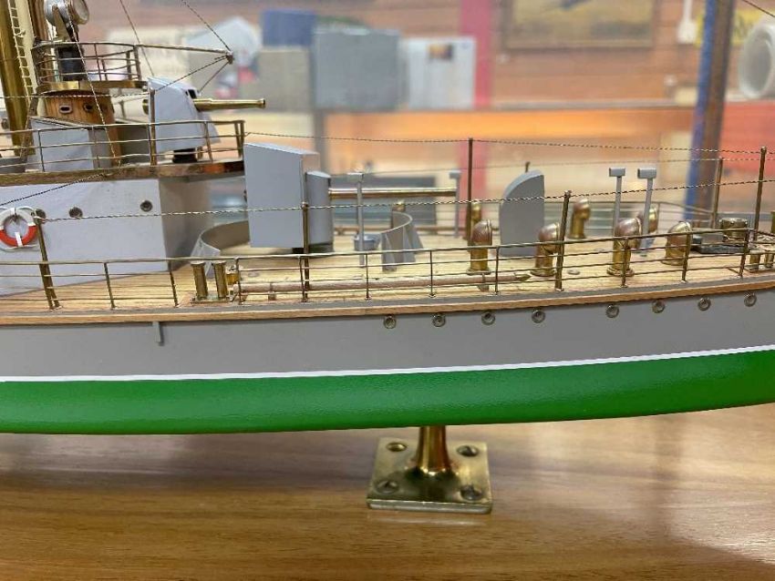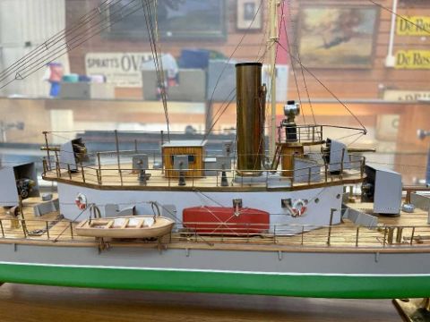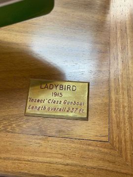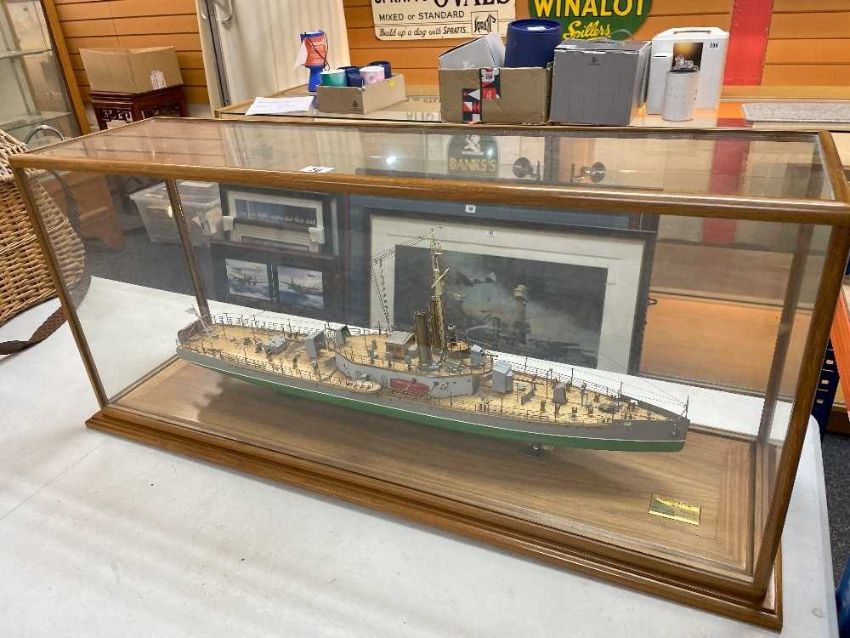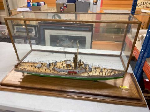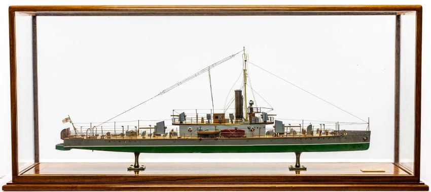 THE MODEL /MARITIME / MILITARY CLUB HOUSE: FINE TO SCALE STUDY OF THE INSECT-CLASS RIVER GUNBOAT H.M.S. LADYBIRD, 1:96 scale, modelled in detail with mast, rigging, radio aerials, jack staffs, anchors with chains, hawsepipes and capstan, ventilators, companionways, main and secondary armament, superstructure with wheelhouse with search light over, twin stayed funnels with safety valve extension pipes, lifeboats swung out in davits and many other details. The hull with twin, inset three-blade brass propellers and three shallow-draught rudders, is finished in green and grey with a lined wooden deck, all supported on brass columns and presented in glazed case, case 92 (w) x 27.5 (d) x 40cms (h)Provenance: private collection ConwyAuctioneer's notes: HMS Ladybird ordered from Lobnitz and launched on 12th April 1916 as the 1st Royal Navy ship to carry the name. After completion 1917 she was deployed in the Mediterranean where she supported army operations and carried out patrol duties. In 1919 she began service on the China Station and joined the Yangtse Flotilla to protect British shipping and British nationals during an emergency. The ship was damaged by Japanese artillery after the Japanese invasion of China in 1938.Comments: excellent.
