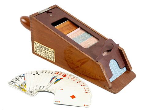 THE GAMES CLUB HOUSE: VINTAGE FRENCH J.A.L. PARIS "LE BANQUIER" BACCARAT CARD DEALING SHOE, with ivorine plaque and handle, counting cards, 12.5 x 38 x 11.5cmsProvenance: private collection ConwyComment: ordinary used condition.