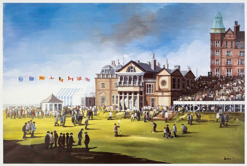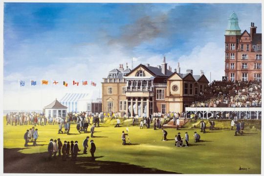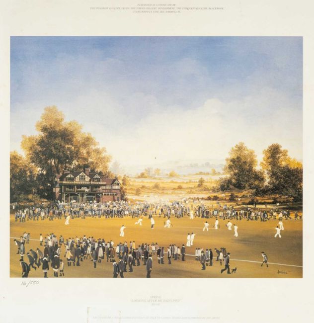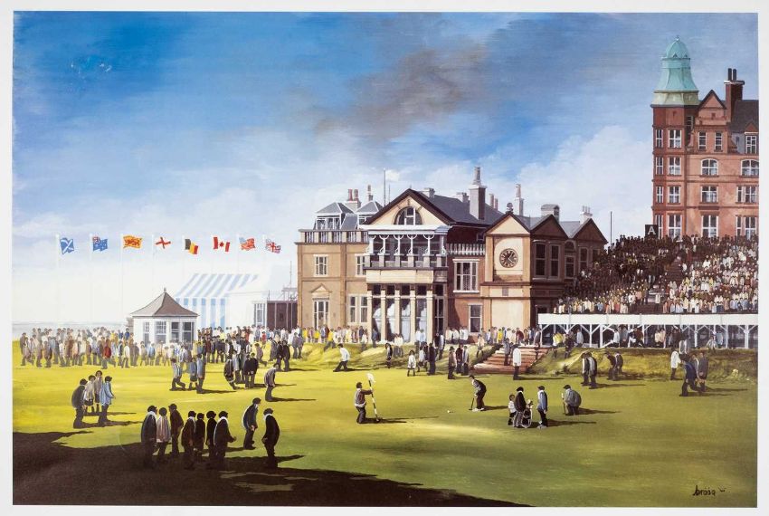 THE GOLF CLUB HOUSE: SIX BRIAN SHIELDS COLOUR PRINTS: comprising 5x 'Does that Mean the Bags Full of Tea?' depicting the 18th at St. Andrews, unsigned & unnumbered (I) 40 x 60.5cms, and 1x 'Spring - Looking After Me Dad's Pint' depicting a cricket match, numbered in pencil 16/500, (I) 26 x 31.5cms (6)Provenance: private collection Clwyd.Comment: cricket print toned, all unframed & minorly dust soiled with marginal bumps and v. slight foxing.
